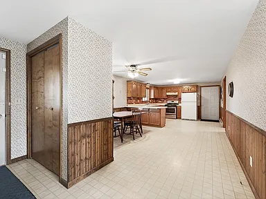 The home was built in 1993 and is situated on a 3.8-acre lot — with open land and trees, providing the property with natural surroundings and privacy. Inside, the home features a spacious, open kitchen with dining area, first-floor laundry, and a full open basement, which offers plenty of space for storage .