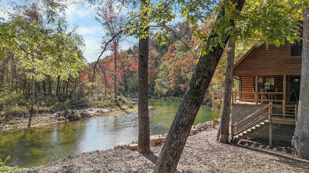 The 1,272-square-foot cabin includes a main-floor primary suite with an attached full bathroom. Moreover, the kitchen features custom cedar cabinetry that adds warmth and character to the space. Also, the open-concept living area supports gatherings with easy flow between rooms. In addition, the upper level provides two open bedrooms, a full bathroom, and a balcony overlooking the creek. Furthermore, the layout gives families and guests separate sleeping areas without losing the shared feel of the home. With this, the cabin delivers both daily comfort and easy hosting.