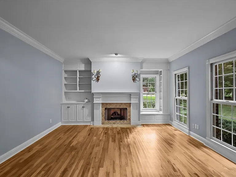 The home’s spacious entrance opens to a grand foyer with stone floors and a classic nursery, while the family room and kitchen merge into an open space that flows through the living area.