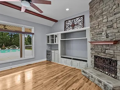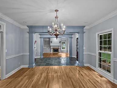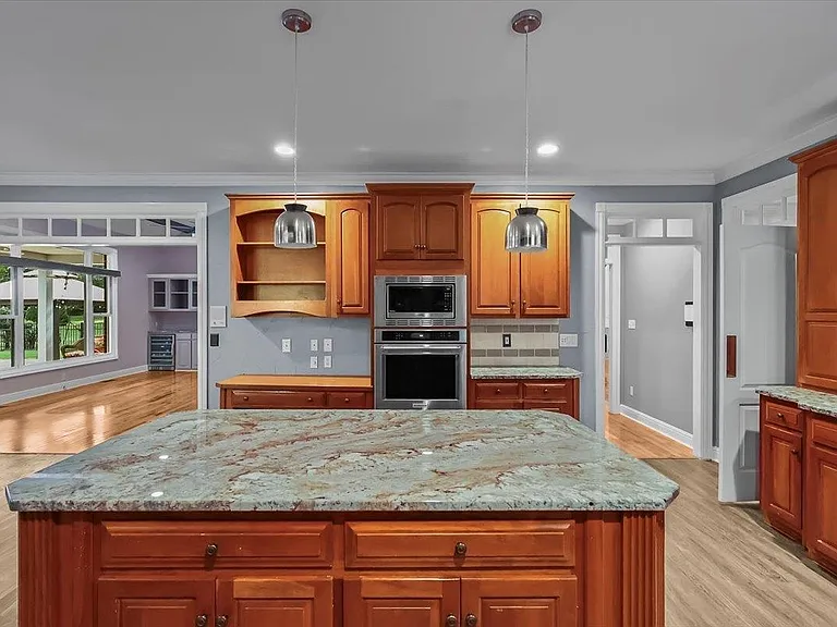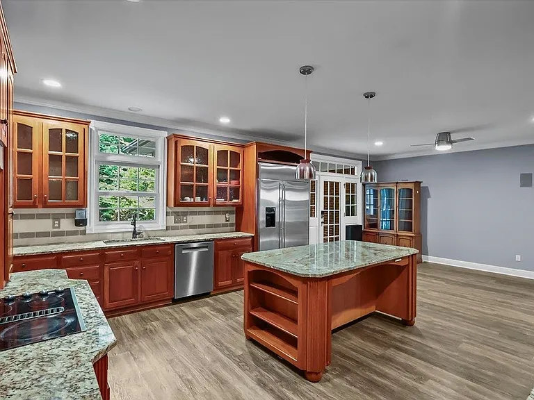 The kitchen is equipped with custom cabinetry, porcelain countertops, and a dining area that offers plenty of space for cooking. From the family room, French doors lead to a covered back porch, creating a peaceful connection between the interior space and the lush yard.