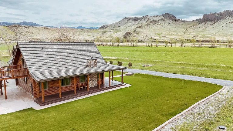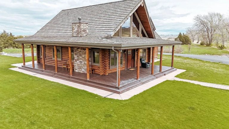 The residence features a thoughtfully arranged floor plan with two bedrooms and four bathrooms, designed for both daily living and entertaining. Heated bathroom floors enhance comfort during Montana’s colder seasons, while quartz countertops and warm wood finishes provide durability and style. A wraparound porch expands the living area outdoors, creating an inviting space to relax and enjoy the scenery. Quality construction and practical design help keep maintenance manageable while blending traditional log home character with modern functionality.