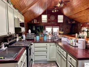 The kitchen offers generous room for cooking and gathering, complemented by stainless steel appliances that blend modern convenience with cabin character.