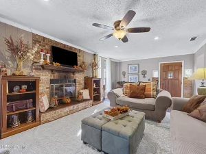 The large family room features a brick gas-burning fireplace, creating a cozy focal point ideal for gatherings, entertaining, or relaxing evenings at home.