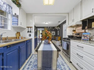 The galley kitchen maintains its country feel and includes a gas range favored by many home cooks. With thoughtful updates, this space could easily become a charming farmhouse-style kitchen.