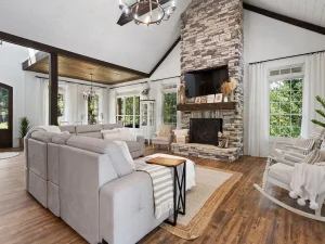 The main living room features soaring cathedral ceilings with exposed beams, a dramatic floor-to-ceiling stacked stone gas fireplace, and expansive windows capturing views of the pool and surrounding woods. Natural light fills the interior, enhanced by shiplap accents and custom details that reinforce the farmhouse aesthetic.