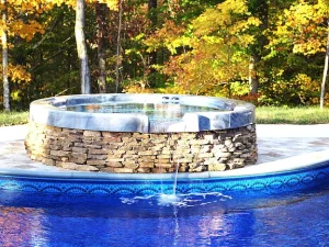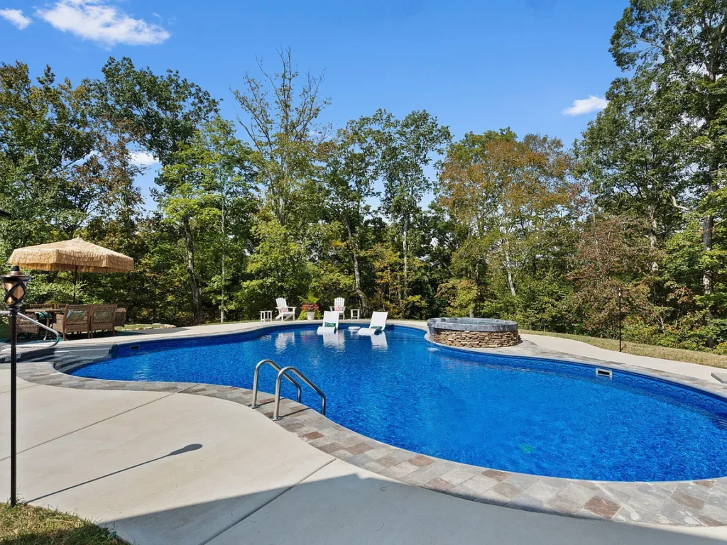 The lagoon-style saltwater pool features a sun shelf with in-pool loungers, diving board, and elegant natural styling. Adjacent, a stacked-stone hot tub spills gently into the pool, creating a calming waterfall effect.