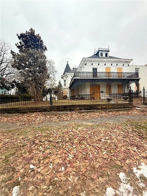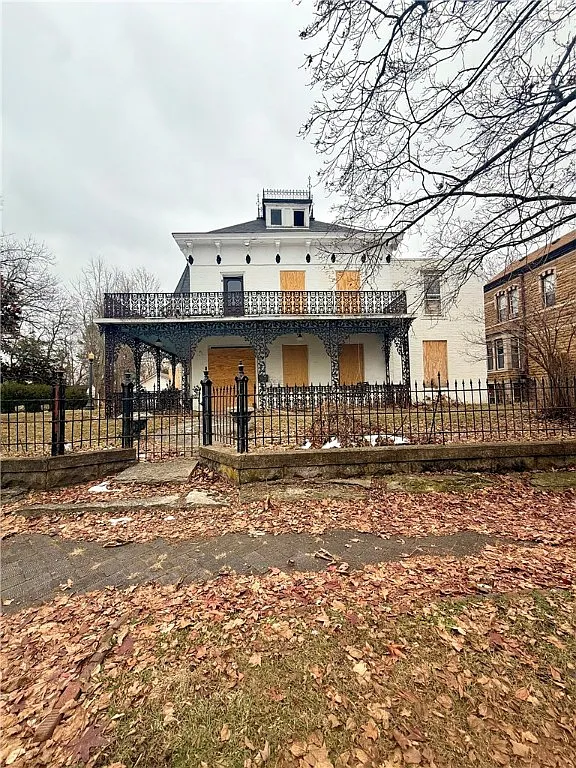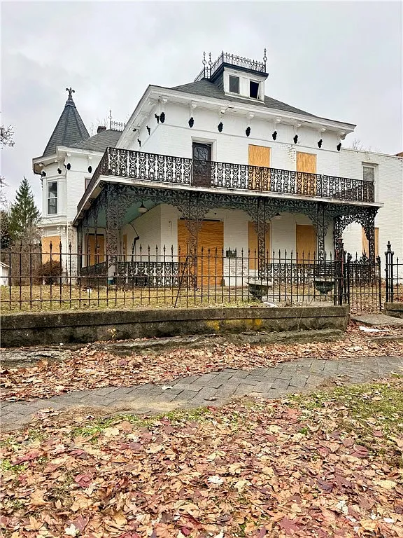 Approaching the home, its historic presence is immediately apparent. A brick driveway leads to a gated yard framed by classic iron fencing, while ornate wrought-iron porch railings complement the solid brick façade and hint at the elegance found inside.