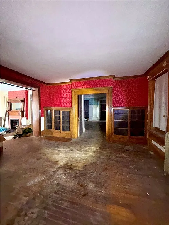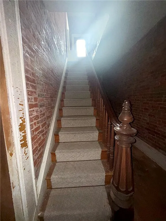 The entry opens into a striking brick parlor featuring original double doors and views toward the grand main staircase, an architectural centerpiece that reflects the craftsmanship of its time. Designed as both functional living space and a statement of refinement, the staircase sets the tone for the home’s impressive interior.