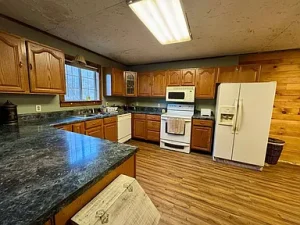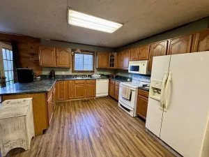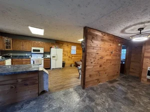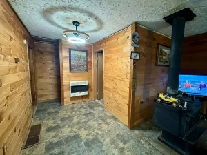 The property includes a charming two-bedroom home with a log-style exterior and a warm, rustic interior. Designed as a raised ranch, the home features tongue-and-groove wood walls and an open-concept layout combining the living room, kitchen, dining area, and laundry space. A wood-burning stove anchors the main living area, creating a cozy atmosphere, while natural light enhances the inviting interior. The home offers approximately 900 square feet of living space and one full bathroom, making it ideal for year-round living or weekend escapes.