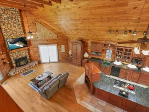 At the center of the property is a beautifully crafted log home designed to combine rustic character with modern comfort. The interior features an open layout with high ceilings and abundant natural light, anchored by a striking stone fireplace that creates a warm and inviting gathering space.