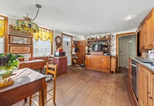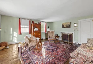 A grand staircase serves as a focal point of the home, leading through formal living spaces designed for both comfort and gathering. The original hearth kitchen stands as a beautiful reminder of early American life, while wide-plank floors and substantial fireplaces create a warm and inviting atmosphere throughout.