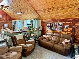 At the center of the property sits a beautifully crafted custom log cabin, built using wood harvested from the land itself. This authentic detail reflects the character of the entire retreat, blending rustic charm with modern comfort. Inside, the home features an open-concept living area with vaulted wood ceilings that create a spacious yet inviting atmosphere, ideal for both relaxing and entertaining.
