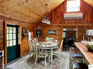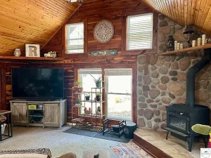 The kitchen offers ample space for cooking and gathering, complemented by modern appliances that balance functionality with the cabin’s rustic appeal. A wood-burning stove anchors the living space, providing warmth and creating a cozy focal point that enhances the overall experience of cabin living.