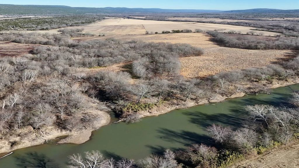The farmhouse sits on a wide stretch of countryside that includes river frontage, wooded sections, and open grassy areas. This combination of natural features creates a landscape that feels private and spacious. The property may attract buyers who appreciate outdoor living, nature, and the freedom that comes with owning a large piece of land.