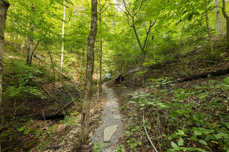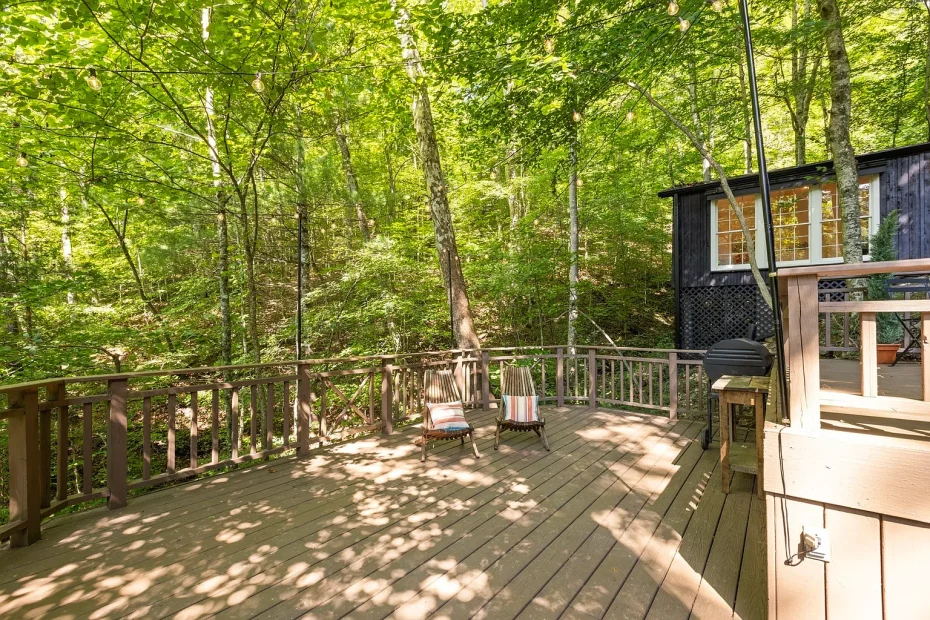 Set within a private, shared community, the property includes access to expansive wooded acreage and a tranquil environment. A second small cabin or guest space adds flexibility, making it convenient for hosting visitors or creating a separate studio area.