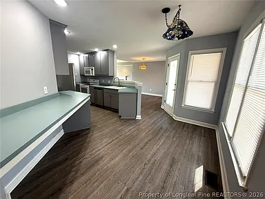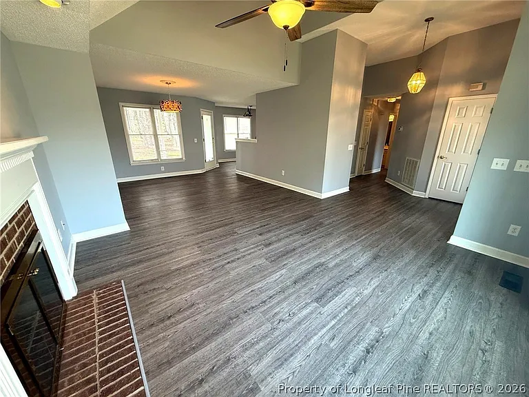 The living area includes a brick fireplace that gives the home a warmer and more welcoming feel, while updated flooring adds a fresh look to the interior. The kitchen and dining area are functionally connected, creating an easy flow of movement and a more practical use of space.