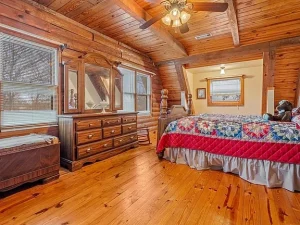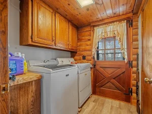 Built with true craftsmanship, the home features solid log walls using tongue-and-groove construction, eliminating the need for excessive sealing while enhancing energy efficiency.