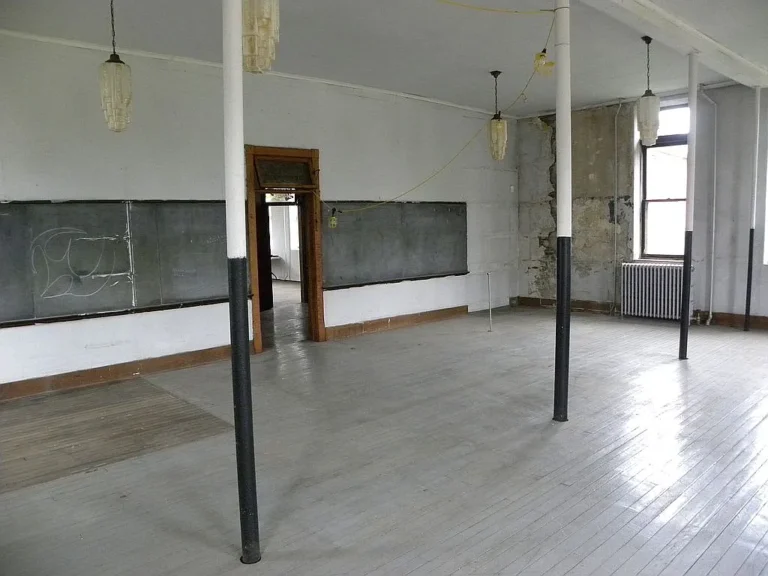 Inside, the building continues to impress with spacious rooms and authentic character. It offers four large classrooms, each measuring approximately thirty-seven feet long and between twenty-five and twenty-nine feet wide, with soaring ceilings reaching twelve and a half feet. These expansive spaces create a sense of openness that is rarely found in modern construction. One classroom still features its original pressed metal ceiling, while slate chalkboards remain along the walls, offering a nostalgic connection to the building’s past as a place of learning.