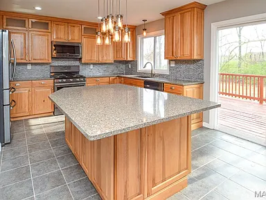 The kitchen is tastefully appointed and includes quality cabinetry, elegant countertops, and a center island ideal for cooking and family gatherings.