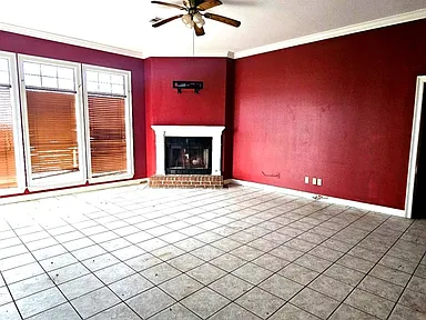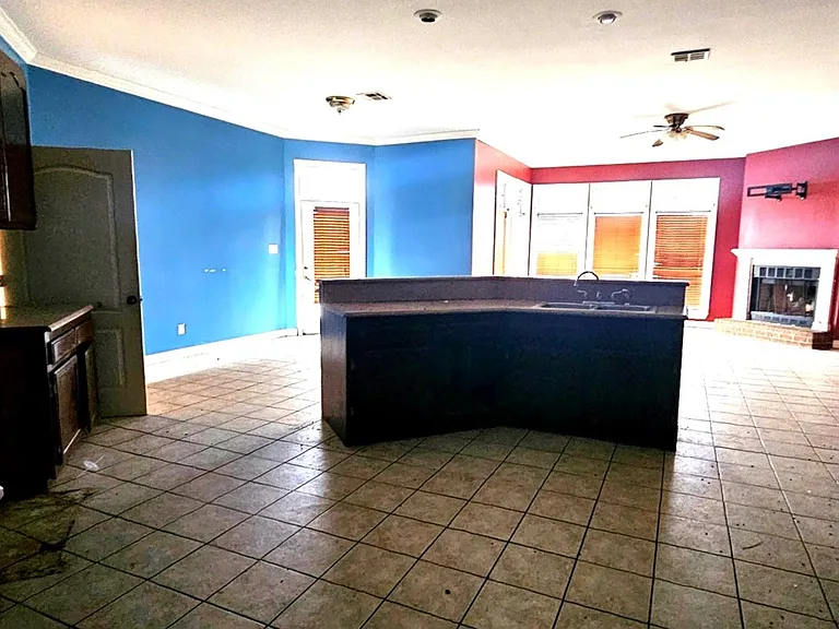The interior includes spacious rooms, a large living room with fireplace and a kitchen with dining area that makes the house feel welcoming and functional.