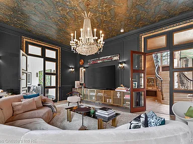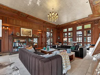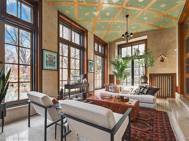 Inside, the home offers expansive living spaces, dramatic craftsmanship, hand-carved woodwork, elegant marble features, and beautifully restored historic elements throughout.