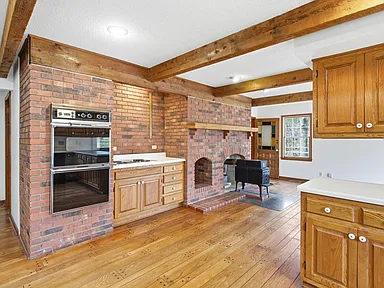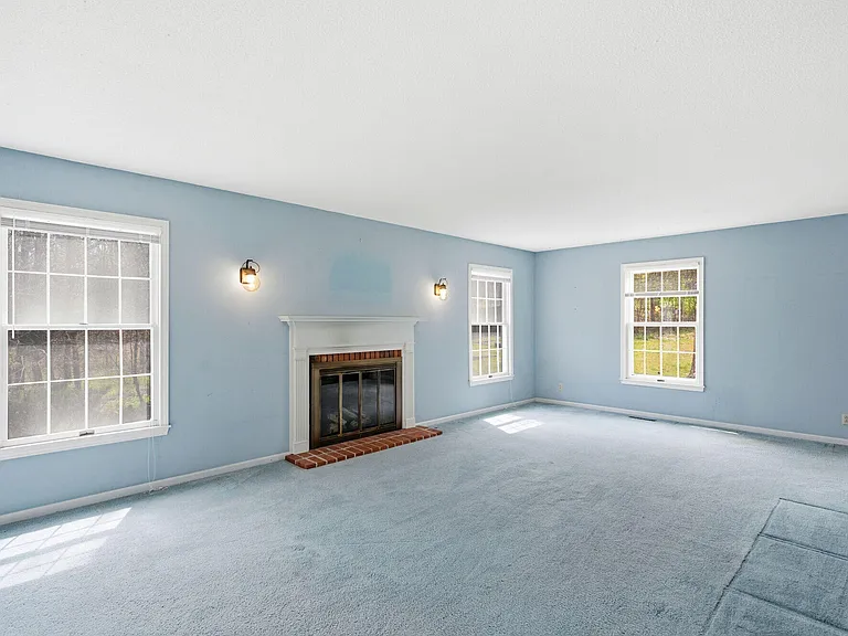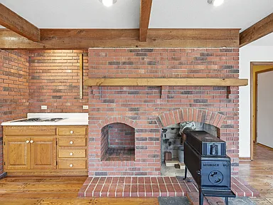 A welcoming living room with a wood-burning fireplace adds classic charm, while an additional family room with a wood-burning stove creates an ideal space for relaxing in any season.