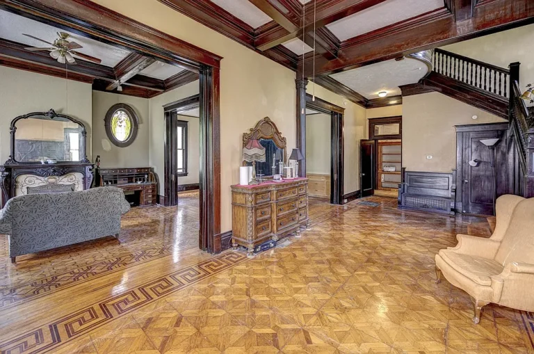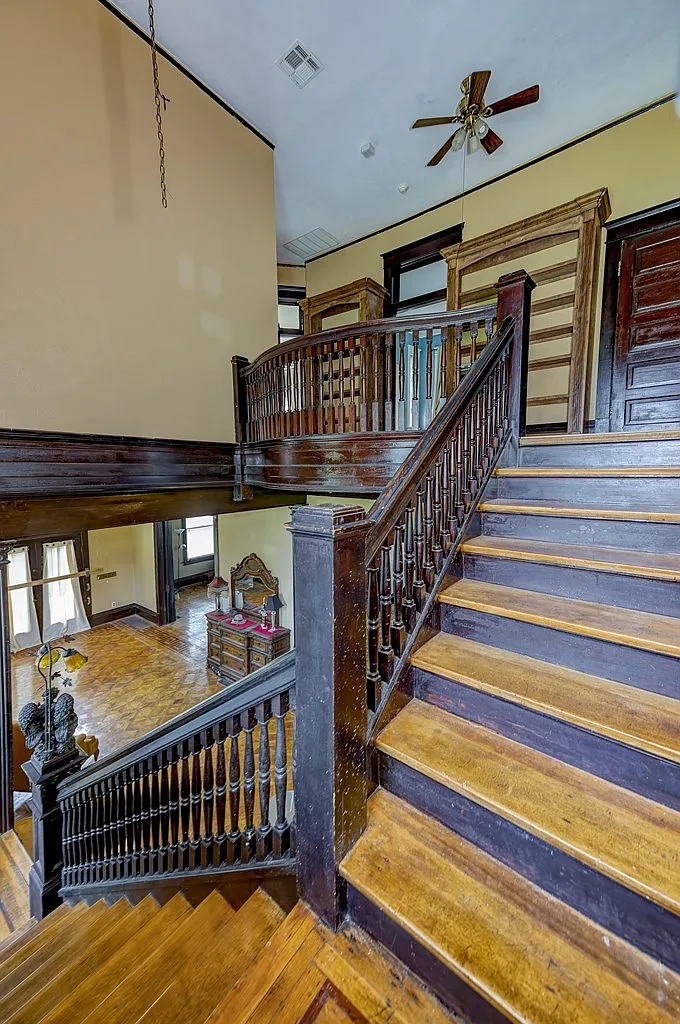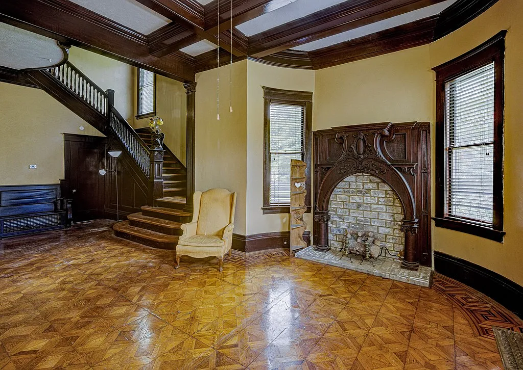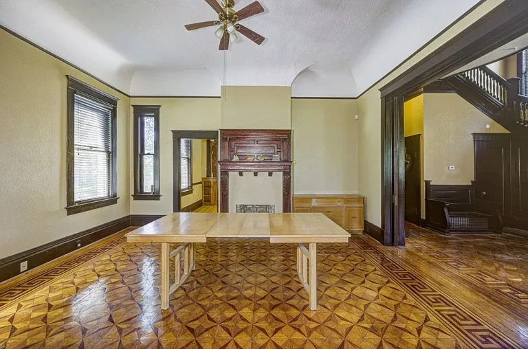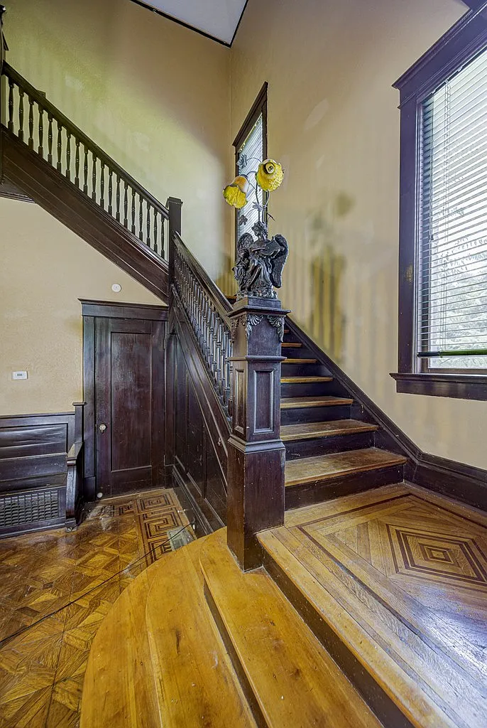 One of the home’s most unforgettable features is its collection of eight fireplaces, each with a distinct mantel that adds warmth, character, and visual interest to the living spaces. An Art Nouveau stained glass window introduces color and artistic beauty, casting light across the interior in a way that enhances the home’s one-of-a-kind atmosphere. Wood pocket doors and a grand staircase further elevate the property’s historic identity, offering both elegance and timeless functionality.