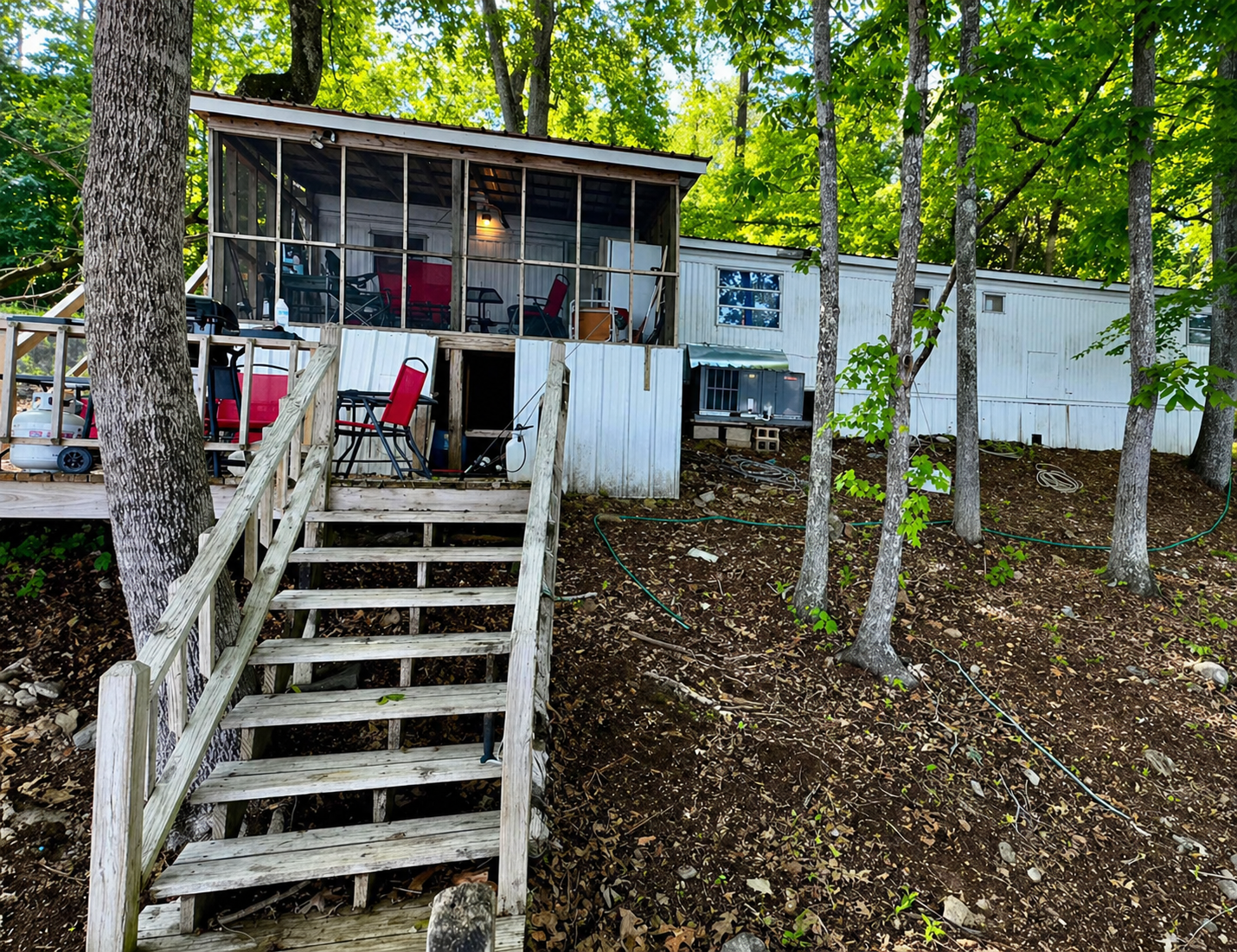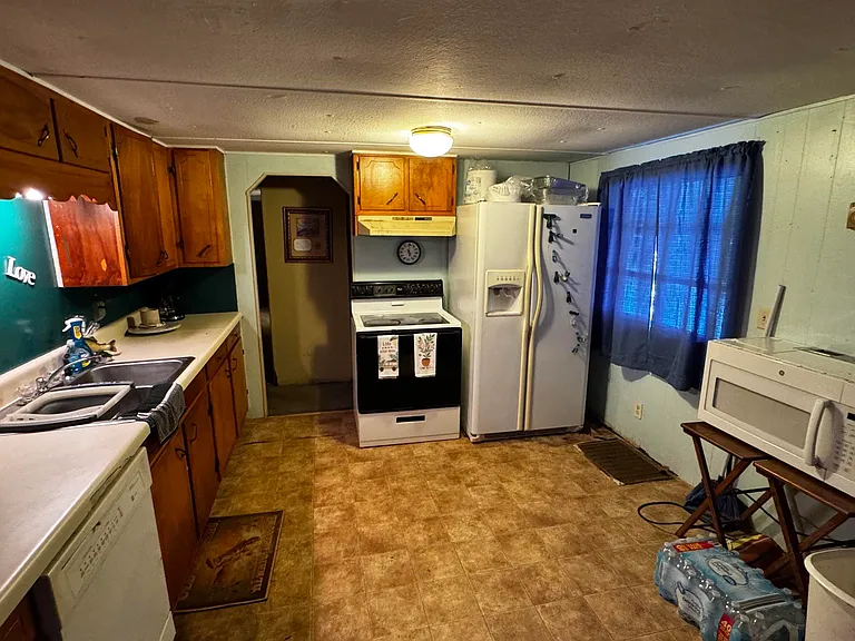 The manufactured home has a modest floor plan that could work well as a personal residence, weekend getaway, rental opportunity, or renovation project.